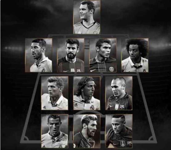 بر اساس تصویر لو رفته، تیم منتخب سال فیفا فیفپرو به شرح زیر است: