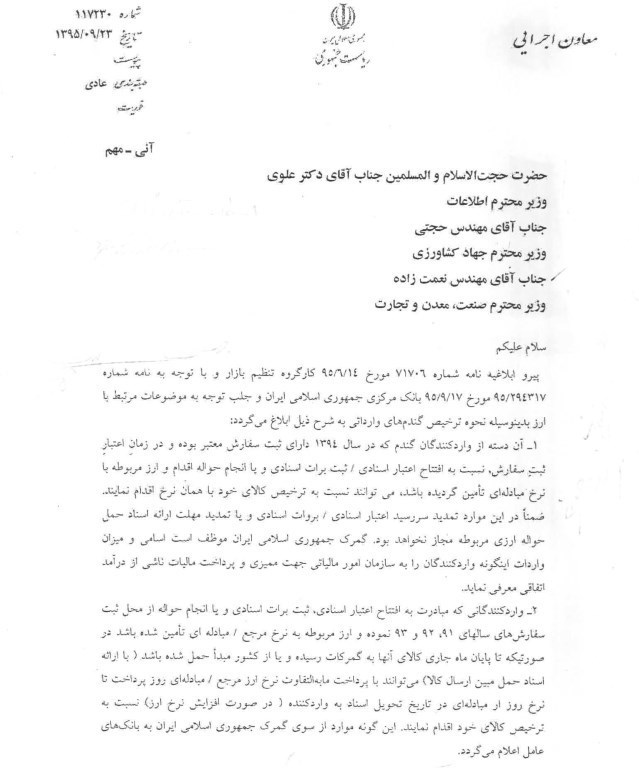 به گزارش خبرنگار اقتصادی خبرگزاری تسنیم، در ابلاغیه محمد شریعتمداری به علوی وزیر اطلاعات، حجتی وزیر جهاد کشاورزی و نعمت زاده وزیر صنعت آمده است: پیرو ابلاغیه نامه شماره 71706 مورخ 14/6/95 کارگروه تنظیم بازار و با توجه به نامه شماره 294317/95 مورخ 17/9/95 بانک مرکزی جمهوری اسلامی ایران و جلب توجه به موضوعات مرتبط با ارز بدینوسیله نحوه ترخیص گندم های وارداتی به شرح زیر ابلاغ می گردد:
