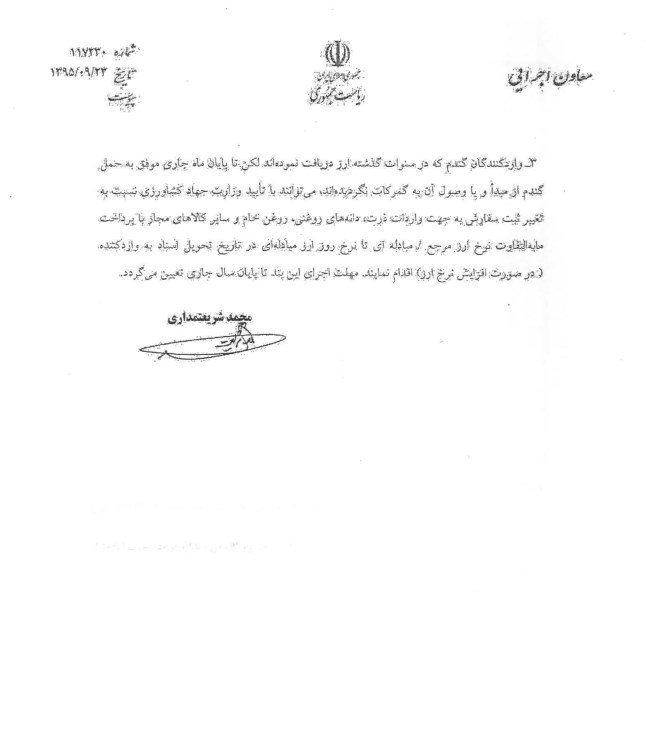 3- واردکنندگان گندم که در سنوات گذشته ارز دریافت نموده اند لکن تا پایان ماه جاری موفق به حمل گندم از مبدا و یا وصول آن به گمرکات نگردیده اند، می توانند با تایید وزارت جهاد کشاورزی نسبت به تغییر ثبت سفارش به جهت واردات ذرت، دانه های روغنی ، روغن خام و سایر کالاهای مجاز با پرداخت ما به التفاوت نرخ ارز مرجع / مبادله ای تا نرخ روز ارز مبادله ای در تاریخ تحویل اسناد به واردکننده (در صورت افزایش نرخ ارز) اقدام نمایند. مهلت اجرای این بند تا پایان سال جاری تعیین می گردد.