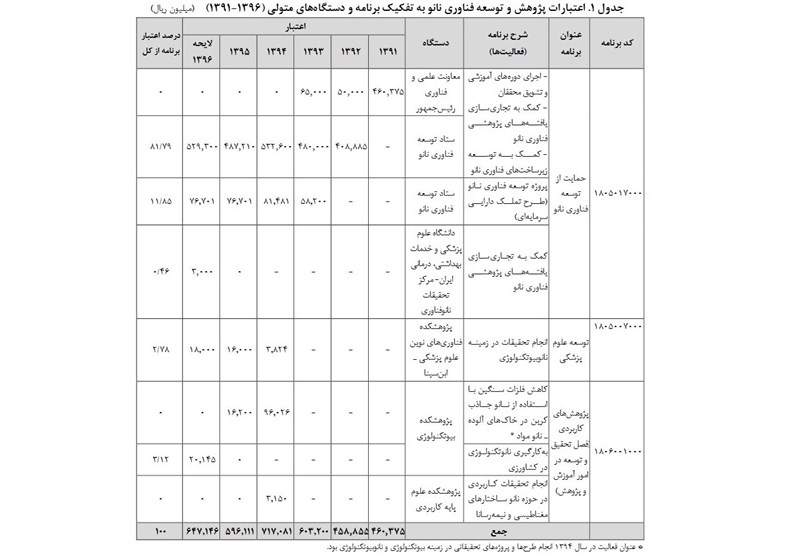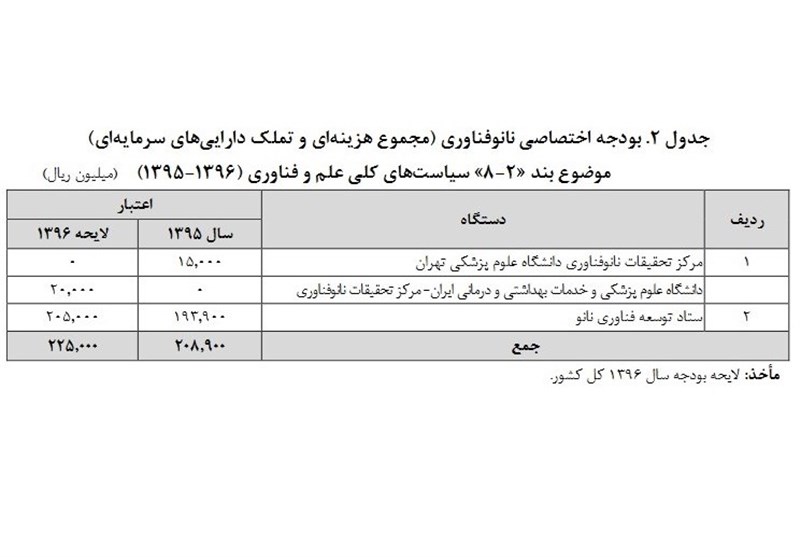 البته به دلیل مشخص نبودن ردیف بودجه اختصاصی فعالیتهای مرتبط با نانو فناوری در لایحه بودجه سال 1396 و قوانین بودجه سالهای اخیر در جدول فوق به آنها اشاره نشده است.