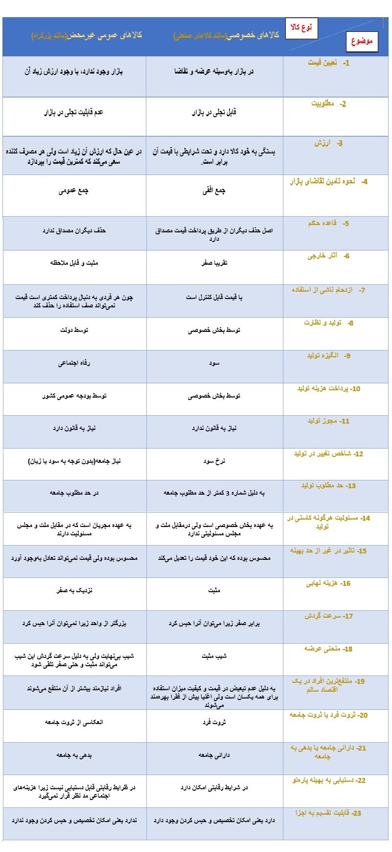 جدول مشخصات کالاهای خصوصی و عمومی(غیرمحض)