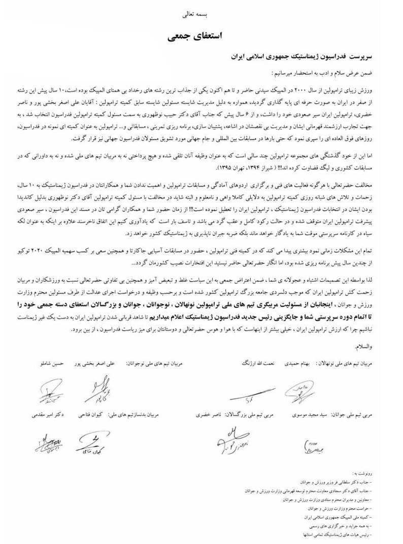 به گزارش خبرنگار ورزشی خبرگزاری تسنیم، «استعفا» واژهای است که این روزها در فدراسیون ژیمناستیک شنیده میشود. پس از استعفای رئیس کمیته مربیان ژیمناستیک هنری، حالا هشت مربی فعال در ترامپولین نیز که در ردههای مختلف ملی حضور دارند، استعفای خود را به فدراسیون ژیمناستیک ارسال کردهاند.