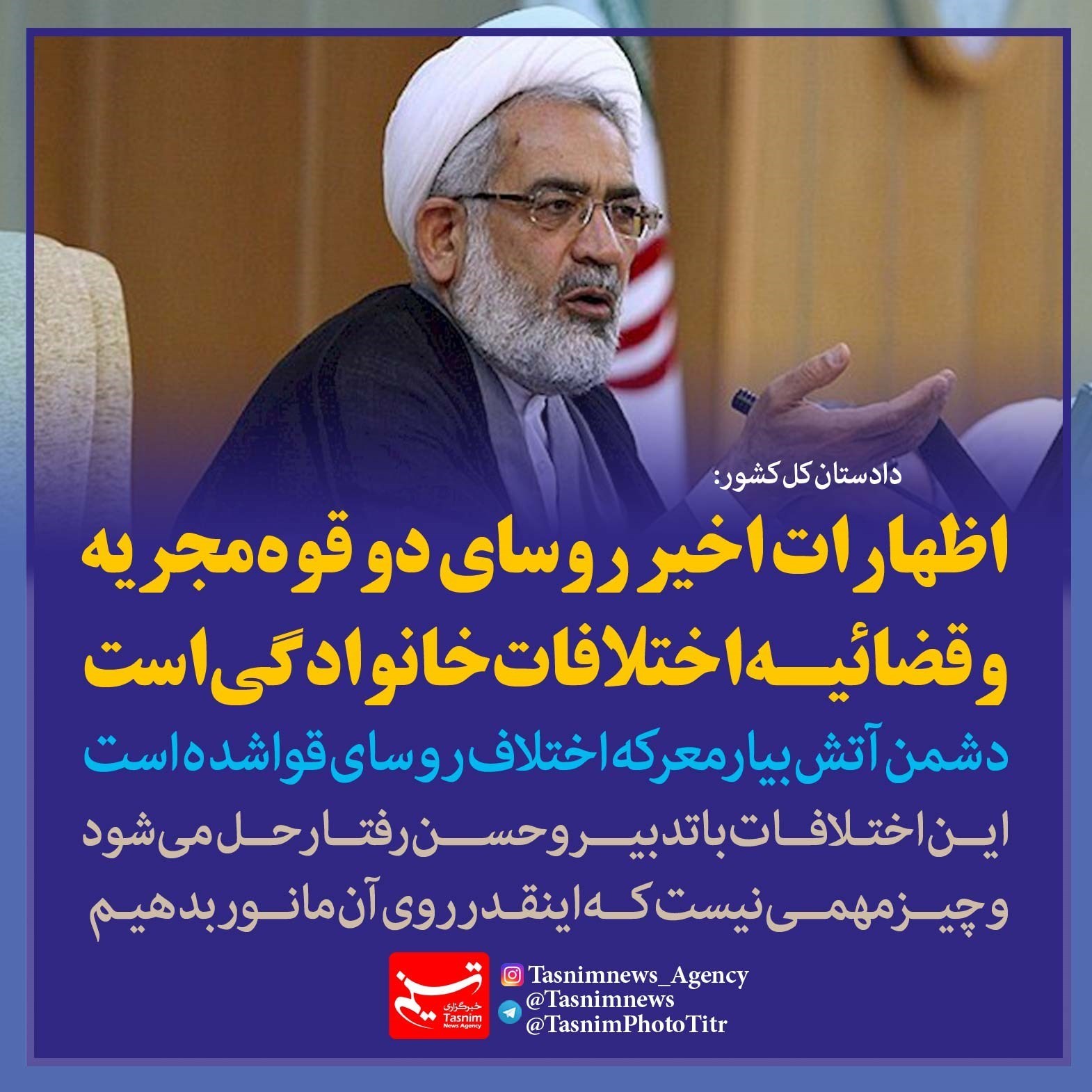 دادستان کل کشور با بیان اینکه اظهارات اخیر روسای دو قوه مجریه و قضائیه اختلافات خانوادگی است گفت: متاسفانه دشمن آتش بیار معرکه شده است.