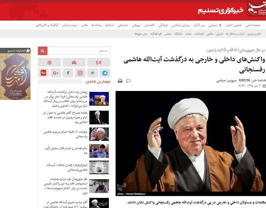 ** واکنشهای داخلی و خارجی به درگذشت آیتالله هاشمی رفسنجانی را در این لینک بخوانید (کلیک کنید)