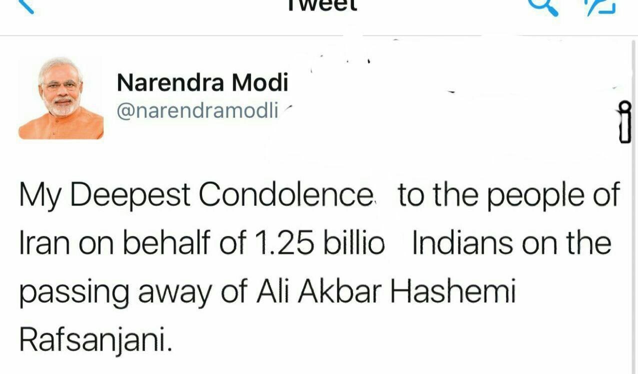 "نارندرا مودی" نخست وزیر هند طی پیامی در توئیتر اعلام کرد که از طرف یک میلیارد و 250 میلیون نفر از هموطنانم عمیقترین تسلیتها را برای درگذشت آیتالله هاشمیرفسنجانی به ملت ایران ابراز میکنم.