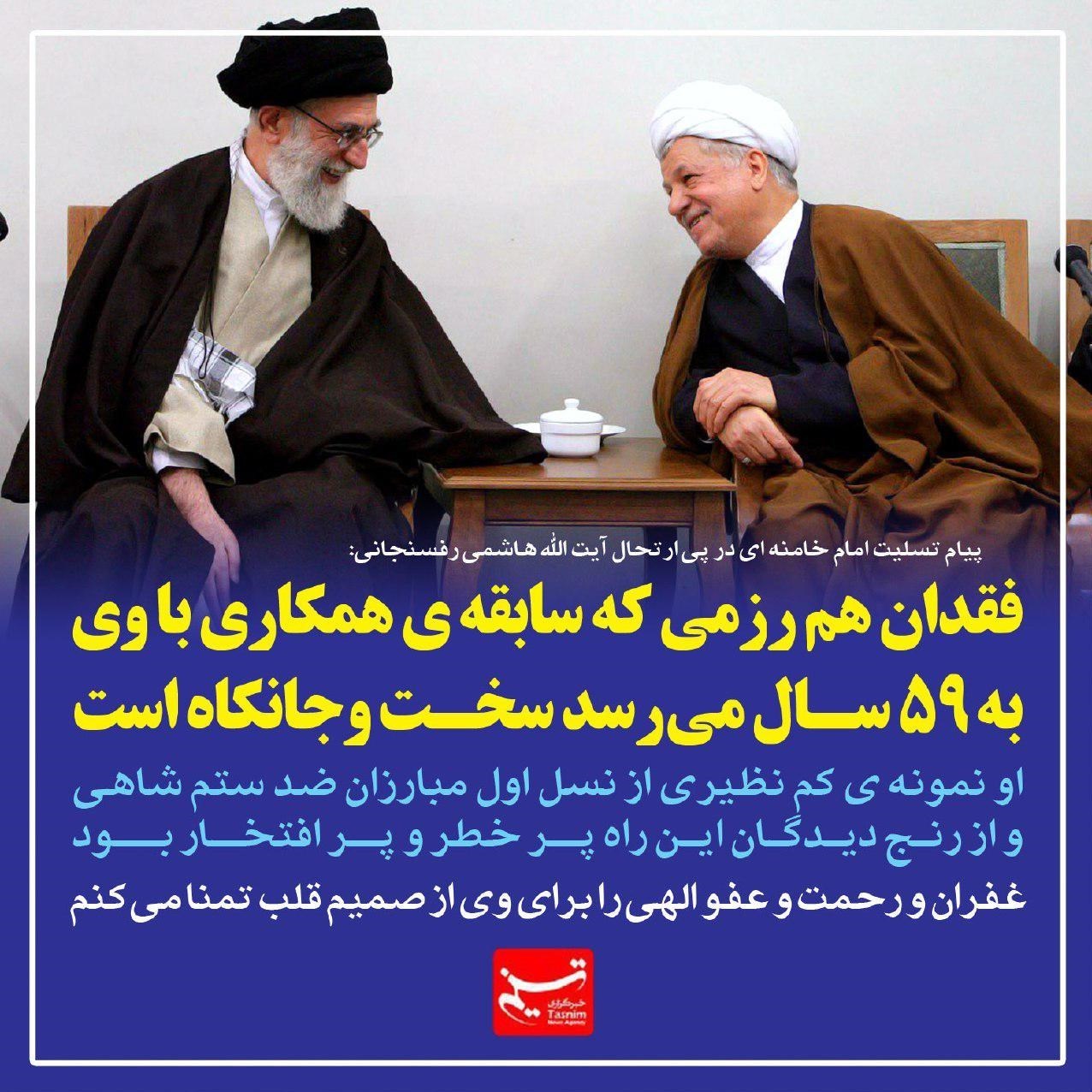فتوتیتر/امام خامنه ای:فقدان هم رزمی که سابقه ی همکاری با وی به 59 سال می رسد سخت و جانکاه است