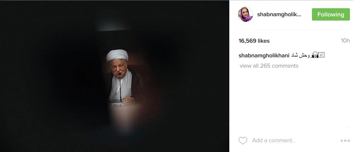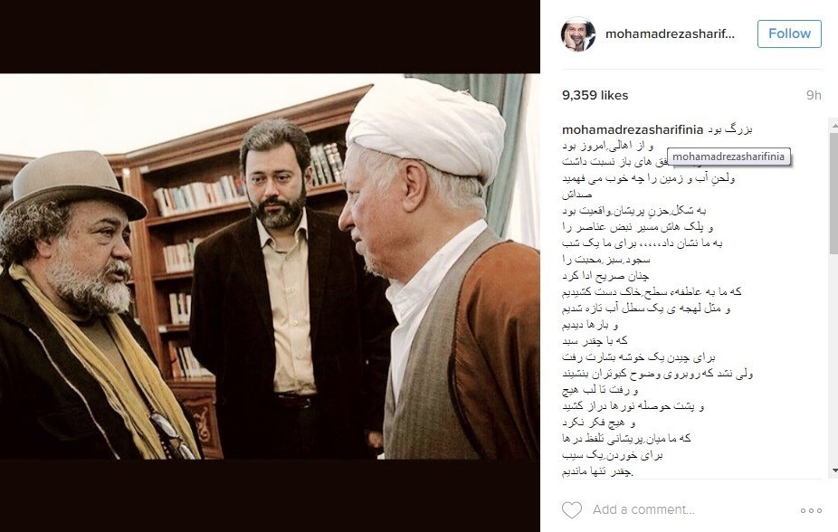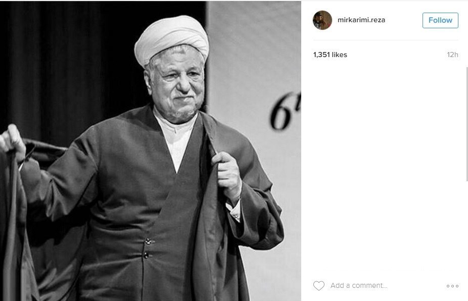 به گزارش خبرنگار فرهنگی باشگاه خبرنگاران تسنیم «پویا»، شب گذشته با اعلام خبر درگذشت آیت الله هاشمی رفسنجانی، جامعه هنری و فرهنگی کشور در فضای مجازی واکنش خود را نسبت به این خبر اعلام کردند. رضا میرکریمی، دبیر جشنواره بینالمللی فیلم تهران در حساب اینستاگرامی خود تصویر زیر را با عنوان «خداحافظ مرد صبور» منتشر کرد.