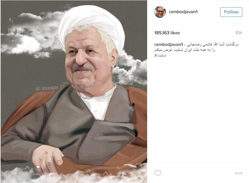 رامبد جوان نیز تصویر نقاشیوار از آیت الله منتشر کرد و درگذشت او را تسلیت گفت.