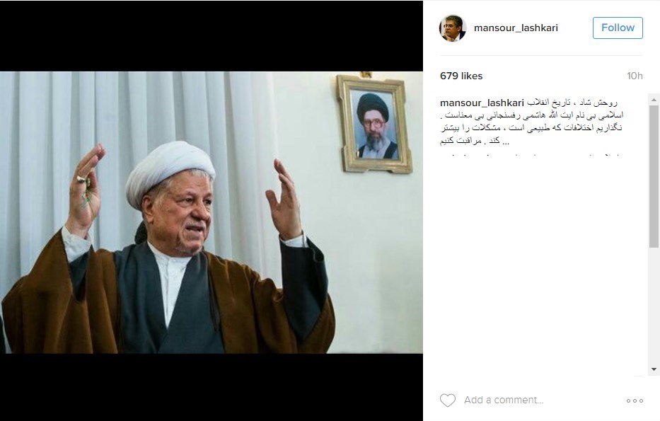 منصور لشکری قوچانی، تهیهکننده پرکار سینما نیز با پیام «اسلام بىنام آیت الله هاشمى رفسنجانى بىمعناست. نگذاریم اختلافات که طبیعى است، مشکلات را بیشتر کند. مراقبت کنیم.» تصویر زیر را منتشر کرد.