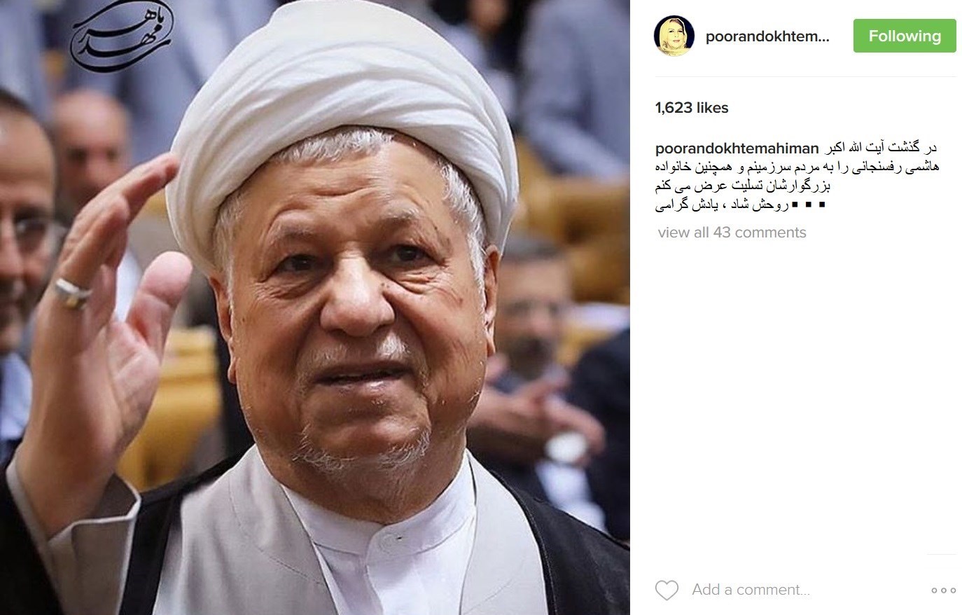 پوران دخت مهیمن نیز بانوشتن متنی درگذشت آیت الله هاشمی رفسنجانی را به خانواده وی تسلیت گفت.