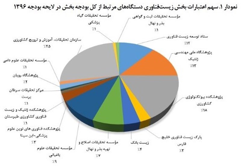 همانطور که در نمودار مشخص است، حدود یک چهارم اعتبارات کل زیست فناوری لایحه بودجه 1396 متعلق به سازمان تحقیقات، آموزش و ترویج کشاورزی است.