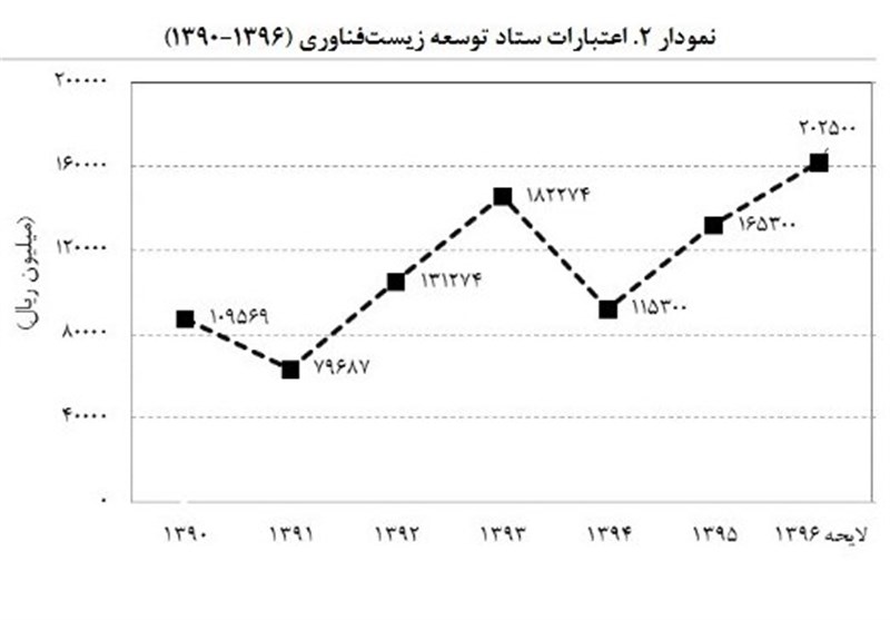 اعتبارات پیشبینی شده برای بخش زیست فناوری در لایحه بودجه سال 1396 نسبت به قانون بودجه سال 1395 حدود 17 درصد افزایش یافته است و به حدود هزار و 803 میلیارد ریال میرسد.
