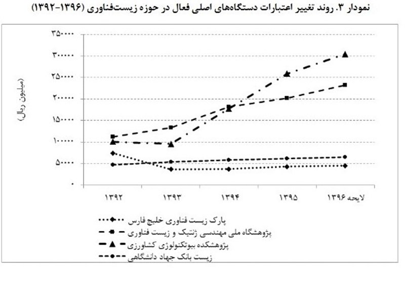 دستگاههایی که تمامی فعالیتهای آنها مرتبط با حوزه زیست فناوری است یعنی پارک زیست فناوری خلیج فارس، پژوهشگاه ملی مهندسی ژنتیک و زیست فناوری، پژوهشکده بیوتکنولوژی کشاورزی و زیست بانک جهاد دانشگاهی را میتوان به عنوان دستگاههای اصلی فعال در حوزه زیست فناوری در نظر گرفت؛ روند تغییرات اعتبارات این دستگاهها طی سالهای 1392-1396 در نمودار زیر نشان داده شده است.