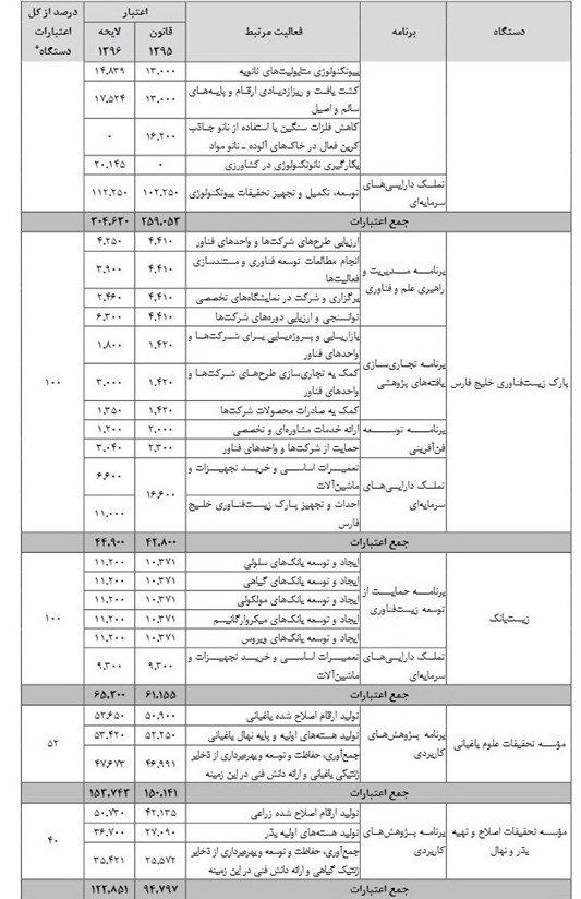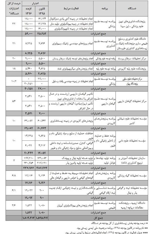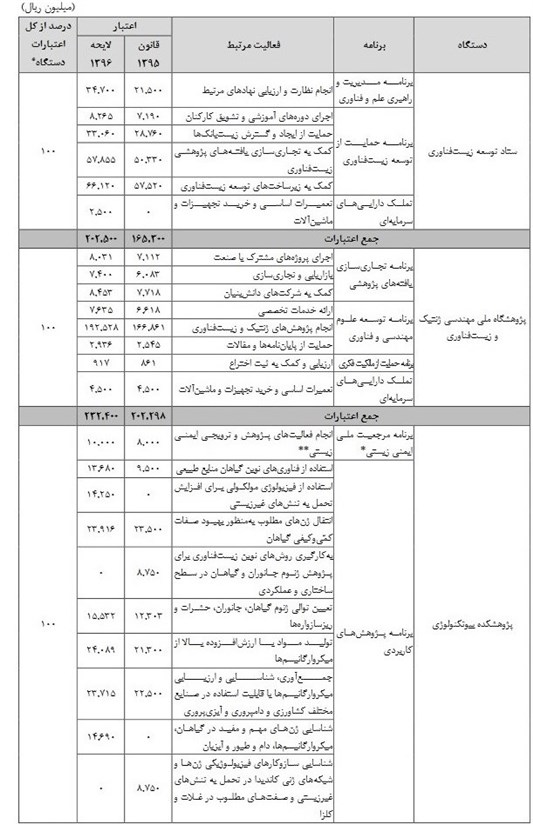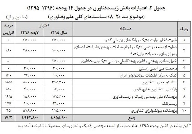 طبق جدول 14 لایحه بودجه سال 1396 (موضوع بند 2-8 سیاستهای کلی علم و فناوری) اعتباری در حدود یک هزار و 943 میلیارد ریال نیز برای پژوهش و فناوری در حوزه زیست فناوری برای دستگاههای مرتبط در نظر گرفته شده است که اگر این اعتبارات به اعتبارات دستگاه ـ برنامه اضافه شود، اعتبارات کل بخش زیست فناوری به حدود سه هزار 746 میلیارد ریال افزایش مییابد همچنین اعتبارات در نظر گرفته شده در جدول 14 ماده واحده برای بخش زیست فناوری اغلب نسبت به قانون بودجه 1395 افزایش دارد و بیشترین افزایش اعتبار مربوط به حمایت از توسعه مهندسی ژنتیک و انجام مطالعات و پژوهشهای استانداردسازی و تجاریسازی محصولات تراریخته است که 180 درصد رشد را نشان میدهد.