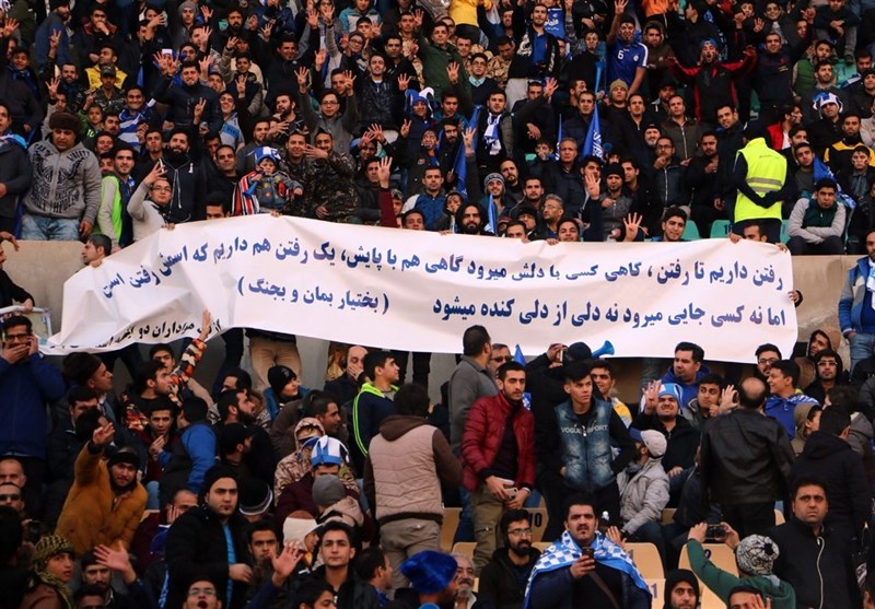 * هواداران استقلال بنری در دست داشتند که روی آن با اشاره به بختیار رحمانی که خواستار جدایی از استقلال شده است، با کنایه گفتند که بماند و بجنگد.
