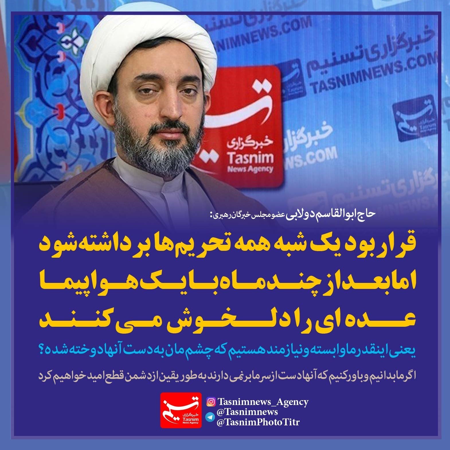 فتوتیتر/حاج‌ابوالقاسم‌دولابی: قرار بود یک شبه همه تحریم‌ها برداشته شود اما بعد از چند ماه با یک هواپیما عده‌ای را دلخوش می‌کنند
