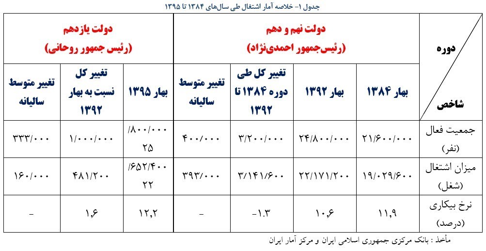 اما اگر همین عدد را برای فاصله بهار سال 1392 یعنی شروع به کار دولت یازدهم تا بهار 1395 بسنجیم، به عدد 481,200 شغل خالص ایجاد شده برای دوره فعالیت دولت یازدهم و حدود 160 هزار نفر شغل سالیانه میرسیم که مشخص میکند چرا نرخ بیکاری در بهار امسال به 12.2 درصد رسیده است، بهعبارتی نقصان مشاغل ایجاد شده در دوره فعالیت دولت یازدهم منجر به افزایش نرخ بیکاری شده است، چرا که دولت یازدهم نتوانسته حتی نصف متوسط سالیانه شغل خالص ایجاد شده در دولتهای نهم و دهم، شغل ایجاد کند و لذا نرخ بیکاری در دولت یازدهم افزایش یافته است (شایان ذکر است اگرچه اشتغال خالص معیار معتبری نیست، کما اینکه کافی است به نوسان شدید فصلی آن توجه شود، معهذا بهدلیل تأکید دولتمردان دوره یازدهم بر این معیار، به آن پرداخته شد).