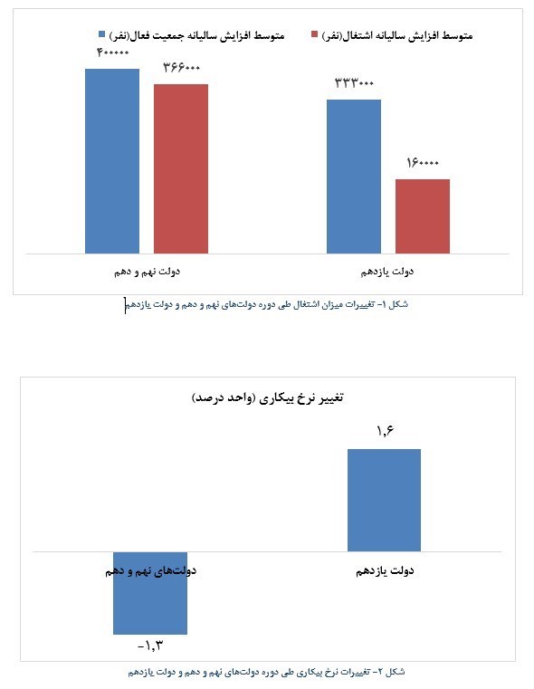 اما در مقابل نرخ بیکاری 10.6 درصدی درآستانه شروع فعالیت دولت یازدهم (یعنی بهار سال 1392)، در بهار سال 1395 به 12.2 درصد رسیده است، آن هم در شرایطی که تنها یکمیلیون نفر به جمعیت فعال کشور افزوده شده است، لذا دلیل کاهش ولو اندک نرخ بیکاری در پایان دولت دهم نسبت به آغاز دولت نهم و در مقابل افزایش قابل توجه 1.6 واحد درصدی نرخ بیکاری در دولت یازدهم را نه در افزایش جمعیت فعال یا عرضه نیروی کار، بلکه در نقصان مشاغل ایجاد شده (تقاضا برای نیروی کار) در دولت یازدهم باید جستجو کرد.