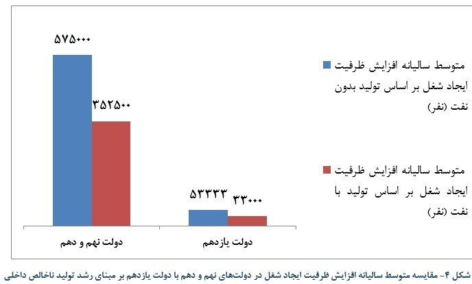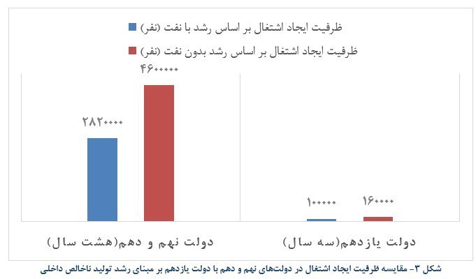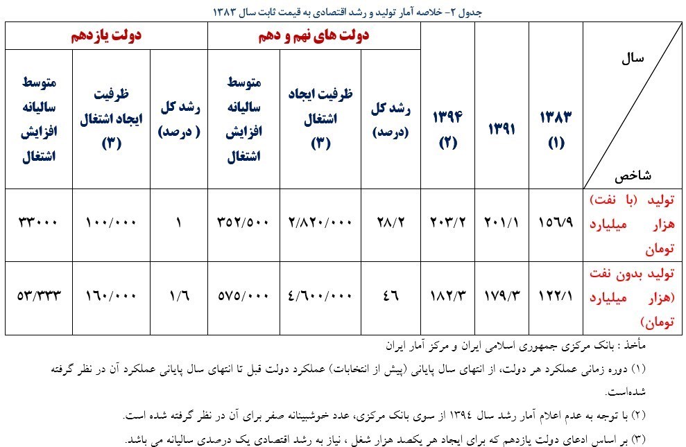 اگر عدد فوق را برای دولت یازدهم تا پایان سال 1394 در نظر بگیریم، رشد اقتصادی کل دوره فعالیت این دولت (تا پایان سال 1394)، با نفت تنها «یک درصد» و بدون نفت «1.6 درصد» میشود که حداکثر میتواند بهترتیب ایجاد 100 و 160 هزار شغل را پشتیبانی کنند که گواه دیگری بر ناکامی دولت یازدهم در ایجاد اشتغال است، حال در شرایطی است که نرخ رشد اقتصادی سال یادشده حداکثر صفر بوده است، ادعا میشود در این سال، حدود 700 هزار شغل ایجاد شده است و مشخص نشده است که چگونه رشد صفر، توانسته 700 هزار شغل ایجاد کند. حال چنانچه حتی رشد پنج درصدی مورد ادعای دولتمردان برای 1395 نیز محقق شود اتفاق چندانی در سال پایانی دولت یازدهم در حیطه اشتغال رقم نمیخورد و حکایت از ناکامی دولت یازدهم در ایجاد شغل تا پایان دوره فعالیتش را دارد، چرا که 5 درصد رشد ادعایی، از محل افزایش صادرات و فروش نفت است که بهدلیل ماهیت سرمایهبری، دولتی بودن و وجود ظرفیت مازاد در بخش نفتی، هیچگاه نمیتوان انتظار داشت که پانصد هزار شغل جدید ایجاد نماید که اگر چنین شود نیز حداکثر متوسط سالیانه ظرفیت ایجاد شغل در دولت یازدهم طی چهار سال فعالیت، به حدود 160 هزار شغل میرسد که هم بهمراتب کمتر از عملکرد اشتغالزایی دولت نهم و دهم است و هم فاصله چشمگیری از ادعای عملکرد هفتصد هزار شغل دولت یازدهم دارد.