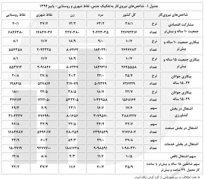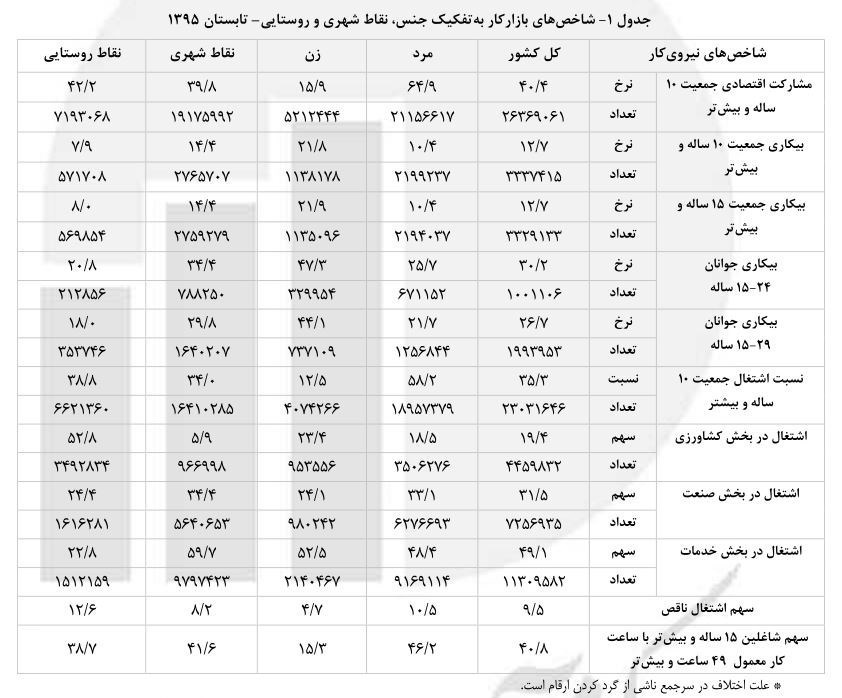 بر اساس گزارش مرکز آمار ایران، نرخ بیکاری در پاییز سال 94 برابر 10.7 درصد بوده است که این رقم در تابستان 95 به 12.7 درصد افزایش یافته است.