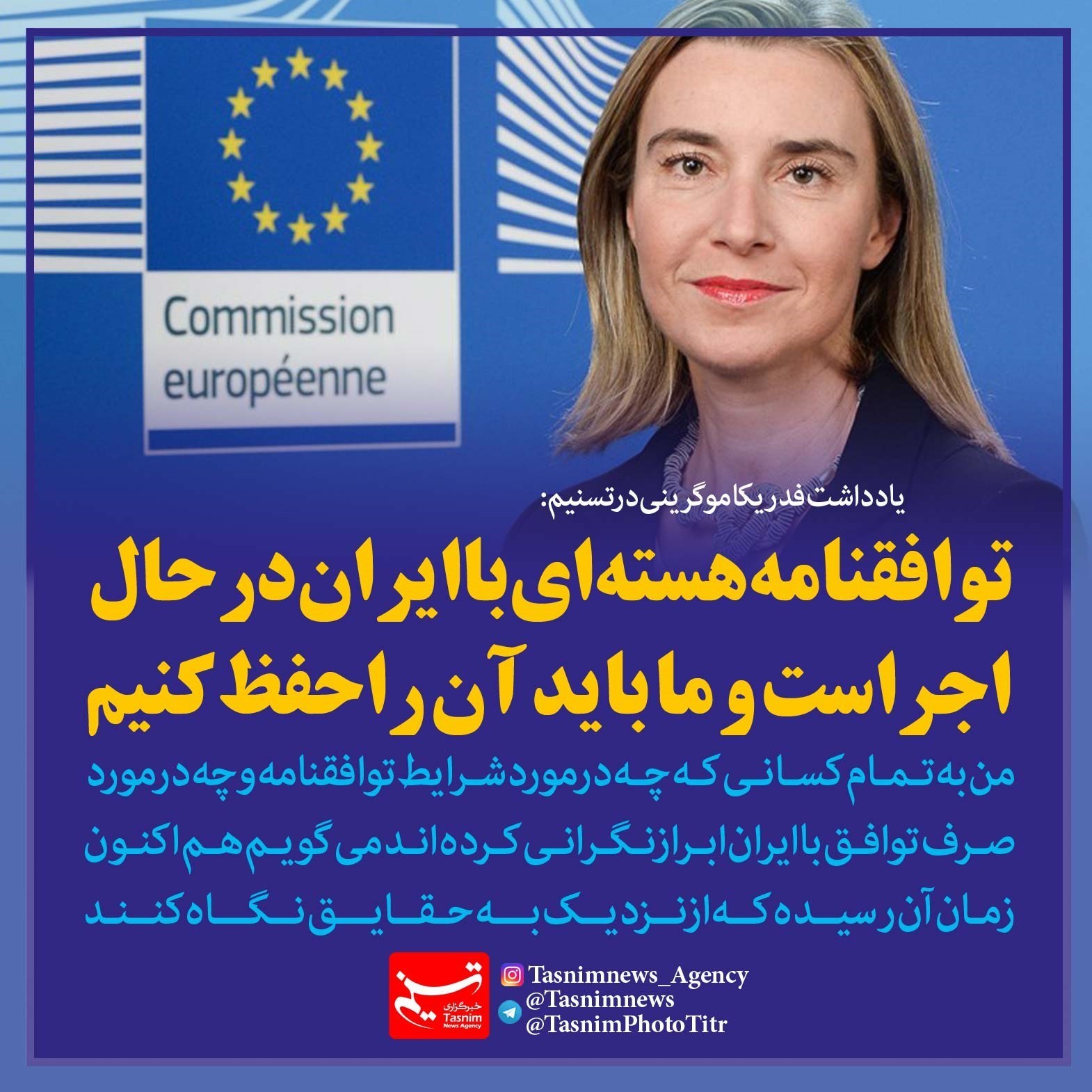 فتوتیتر/موگرینی: توافقنامه هسته‌ای با ایران در حال اجراست و ما باید آن را حفظ کنیم