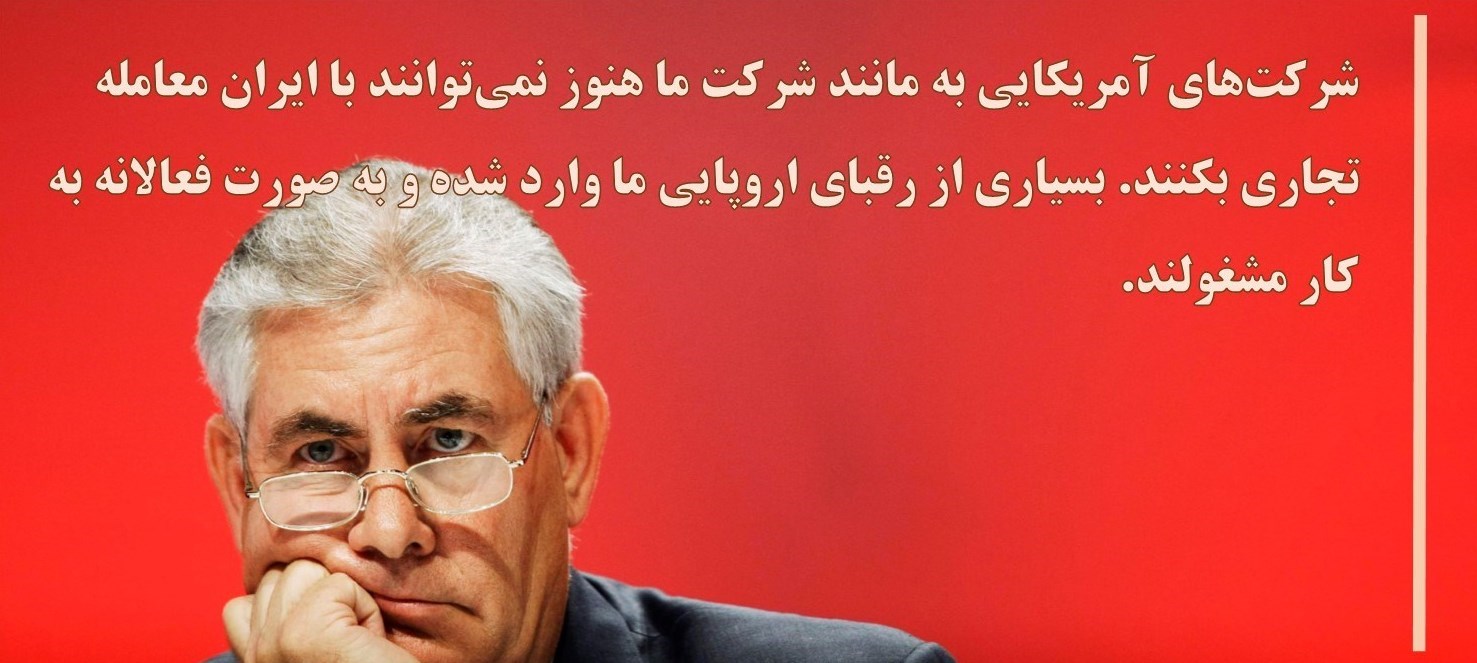 شرکتهای آمریکایی بهمانند شرکت ما هنوز نمیتوانند با ایران معامله تجاری بکنند. بسیاری از رقبای اروپایی ما وارد شده و بهصورت فعالانه به کار مشغولند. من این را نمیدانستم؛ اینکه ما در موقعیت خوبی قرار نداریم. ما به همین دلیل هیچگاه یک سرمایهگذاری بزرگ در ایران انجام ندادیم. و من نمیدانم که ایرانیها امروز تغییر کردهاند یا نه. ما مجبوریم که منتظر مانده و ببینیم ... اما همچنین خیلی وقت پیش یاد گرفتم که گاهی اوقات اولین بودن لزوماً بهترین بودن نیست. ما منتظر میمانیم تا ببینیم آیا وضعیت برای شرکتهای آمریکایی باز میشود. ما یقینا نگاهی خواهیم انداخت زیرا [ایران] کشوری با منابع عظیم است.