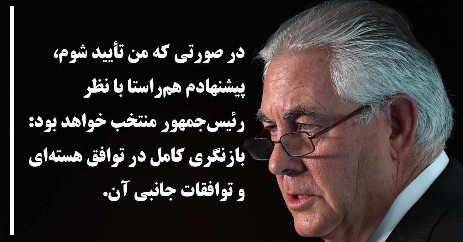 البته نمیتوان خوشبین بود که تیلرسون ایدههایش بهعنوان رئیس شرکت اکسونموبیل را به وزارت خارجه نیز ببرد. وزیر خارجه پیشنهادی رئیسجمهور منتخب آمریکا بعدها اعلام کرد که ترامپ خواستار بازنگری کامل در برجام است. تیلرسون در نشست استماع بررسی تأیید خود در سنا اعلام کرد دونالد ترامپ رئیس جمهور منتخب آمریکا خواستار بازنگری کامل در توافق هستهای ایران و 1+5 است.