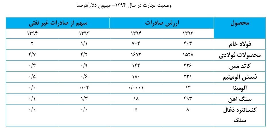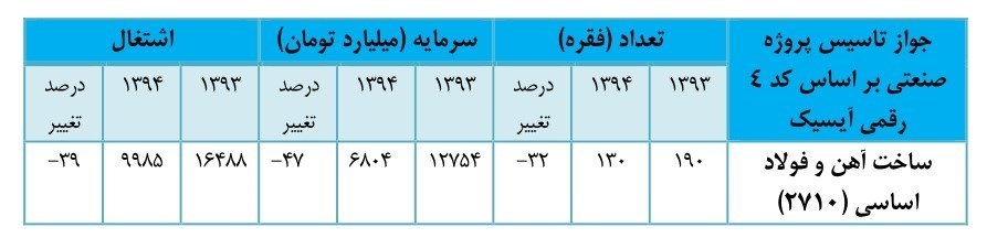 براساس این گزارش تعداد جوازهای تأسیس صنعتی ساخت آهن و فولاد در سال 94 با رشد منفی 32 نسبت به سال 93 مواجه بوده است. در بخش سرمایه گذاری هم رشد منفی 47 درصدی و اشتغال منفی 39 درصد در این حوزه اتفاق افتاده است. طی یک سال گذشته 6500 نفر در این صنعت بیکار شدند. همچنین صادرات مواد معدنی هم در سال 94 رشد قابل توجهی نداشته و فقط ارزش صادارت فولاد خام با رشد 2 درصدی 704 میلیون دلار شده است.