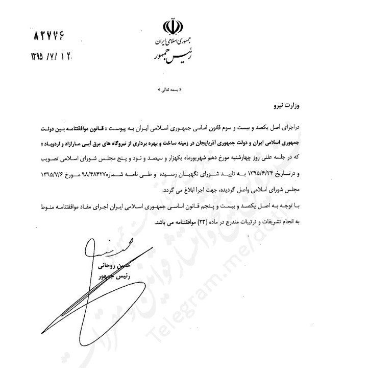 این توافق در خاک دو کشور به قانون همکاری تبدیل شد و رئیس جمهوری ایران در تاریخ دوازدهم مهرماه سال جاری این توافق و آغاز همکاری را در قالب قانونی به وزیر نیرو ابلاغ کرد. در متن ابلاغیه رئیس جمهور آمده است: "در اجرای اصل یکصد و بیست و سوم قانون اساسی جمهوری اسلامی ایران، قانون " موافقنامه بین دولت جمهوری اسلامی ایران و دولت جمهوری آذربایجان در زمینه ساخت و بهره برداری از نیروگاههای برقآبی مارازاد و اردوباد" که در جلسه علنی روز چهارشنبه مورخ دهم شهریورماه یکهزار و سیصد و نود و پنج مجلس شورای اسلامی تصویب و در تاریه 95/6/24 به تأیید شورای نگهبان رسیده و طی نامه شماره 98/48427 مورخ 1395/7/6 مجلس شورای اسلامی واصل گردیده، جهت اجرا ابلاغ می گردد."