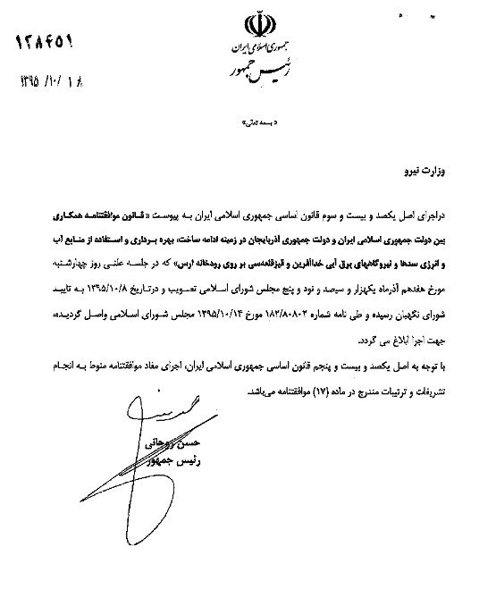 رئیس جمهوری در تاریخ هجدهم دی ماه سال جاری دومین قانون در خصوص همکاری های مشترک دو کشور در رود ارس را به وزیر نیرو ابلاغ کرد. در متن ابلاغیه رئیس جمهور آمده است: "در اجرای اصل یکصد و بیست و سوم قانون اساسی جمهوری اسلامی ایران، قانون " موافقنامه همکاری بین دولت جمهوری اسلامی ایران و دولت جمهوری آذربایجان در زمینه ادامه ساخت، بهره برداری و استفاده از منابع آب و انرژی سدها و نیروگاههای برقآبی خداآفرین و قیزقلعهسی بر روی رودخانه ارس" که در جلسه علنی روز چهارشنبه مورخ هفدهم آذرماه یکهزار و سیصد و نود و پنج مجلس شورای اسلامی تصویب و در تاریخ 95/10/8 به تأیید شورای نگهبان رسیده و طی نامه شماره 182/80802 مورخ 1395/10/14 مجلس شورای اسلامی واصل گردیده، جهت اجرا ابلاغ می گردد."