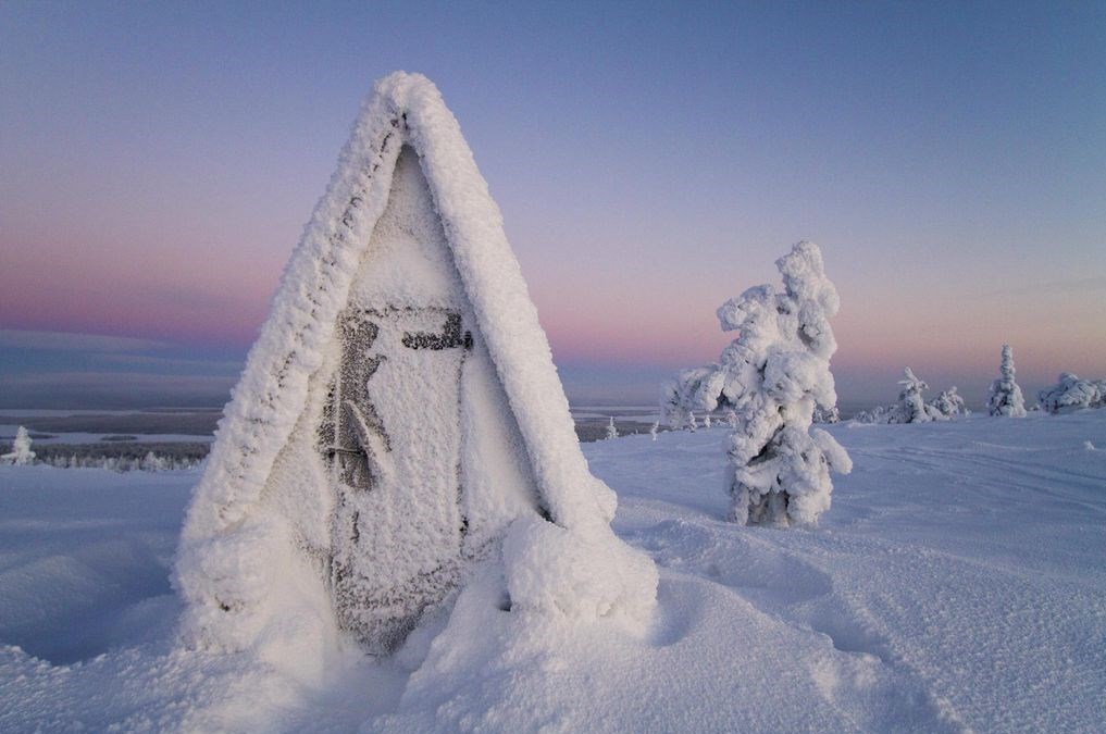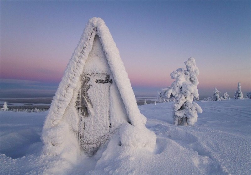 در یک غروب آفتاب که گویی با با مداد رنگی نقاشی شده پوشش سنگین برف یخ زده بر منطقه لاپلند فنلاند نشسته است.