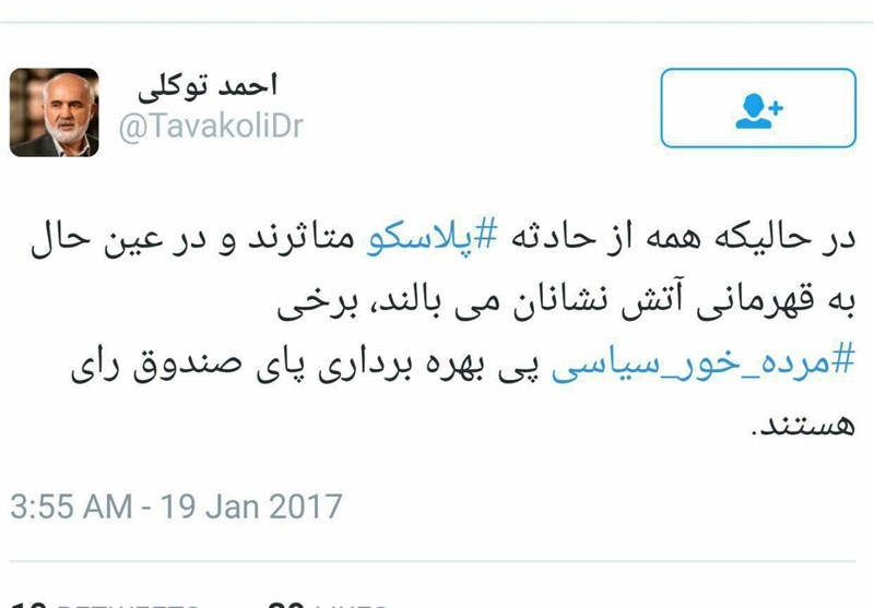 به گزارش گروه رسانه‌های خبرگزاری تسنیم، احمد توکلی نوشت: در حالی که همه از حادثه پلاسکو متأثرند در عین حال به قهرمانی آتش‌نشانان می‌بالند، برخی #مرده_خور_سیاسی پی بهره‌برداری پای صندوق رأی‌اند.