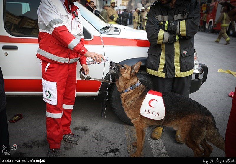 فیلم/استقرار سگهای زنده یاب هلال احمر در پشت ساختمان پلاسکو