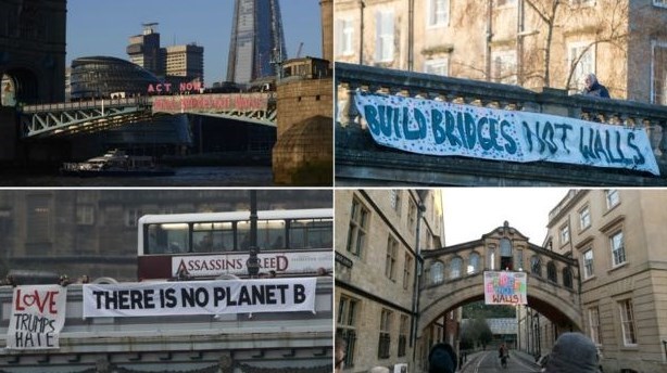 در این روز، در اکثر شهرهای دنیا پلاکاردهایی روی پلها نصب شد که در آنها از ترامپ خواسته شده است سیاست تنفر را کنار بگذارد. روی نه پل در لندن نیز چنین پلاکاردهایی نصب شده است.