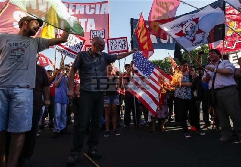 صدها آرژانتینی نیز در اعتراض به آغاز به کار دونالد ترامپ در مقام رئیس جمهور آمریکا روبروی سفارت این کشور در بوئنوس آیرس تظاهرات کردند و پرچم آمریکا را به آتش کشیدند.