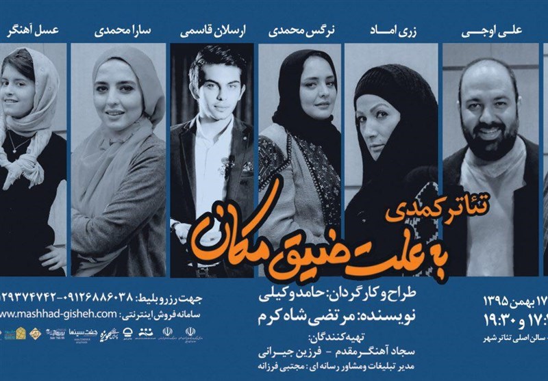 به گزارش تسنیم، «به علت ضیق مکان» به کارگردانی حامد وکیلی و نویسندگی مرتضی شاه کرم، از سه بهمن ماه سال جاری در سالن اصلی تئاتر شهر مشهد روی صحنه میرود و علی اوجی، زری اماد، عسل آهنگر، ارسلان قاسمی، نرگس محمدی، سارا محمدی، حامد وکیلی به عنوان بازیگر حضور دارند. همچنین مجتبی فرزانه مشاوره رسانهای نمایش «به علت ضیق مکان» است.
