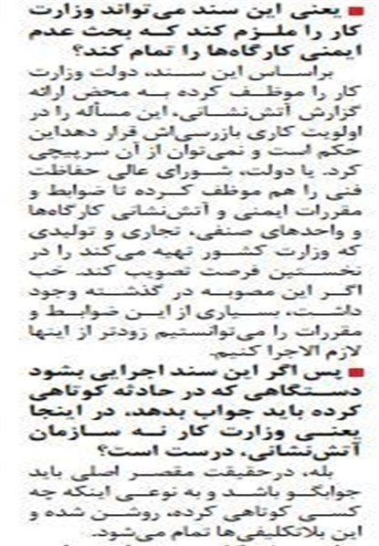در ادامه خبرنگار روزنامه دولتی ایران صریحا از معاون امور شهرداری های معاونت شهرداری ها و دهیاری های وزارت کشور می پرسد «پس اگر این سند اجرایی بشود دستگاهی که در حادثه کوتاهی کرده باید جواب بدهد، در اینجا یعنی وزارت کار نه سازمان آتشنشانی، درست است؟» می گوید: « بله، درحقیقت مقصر اصلی باید جوابگو باشد و به نوعی اینکه چه کسی کوتاهی کرده، روشن شده و این بلاتکلیفیها تمام میشود؛ ... در همین سند آمده اگر آتشنشانی در بازدیدهای موردی خود با یک اشکال فنی در تأسیسات دولتی برخورد کرد و تشخیص داد در صورت بر طرف نشدن، خطر مالی و جانی برای مردم به همراه دارد، دستگاه مسئول مکلف است رفع خطر کند. درحالی که در گذشته این الزام وجود نداشت و در حد یک تذکر بود.»