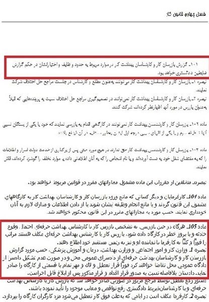 در بندهای بعدی این قانون، وظیفه وزارت کار درباره کارگاه های ناایمن بسیار صریح تر مورد تاکید قرار میگیرد؛ ماده 105 قانون کار تاکید دارد که «هرگاه در حین بازرسی به تشخیص بازرس کار یا کارشناسان بهداشت حرفه ای احتمال وقوع حادثه و یا بروز خطر در کارگاه داده شود، بازرس کار یا کارشناس بهداشت حرفه ای مکلف است مراتب را کتبا و فورا به کارفرما و یا نماینده او و نیز رئیس مستقیم خود ارائه دهد.»