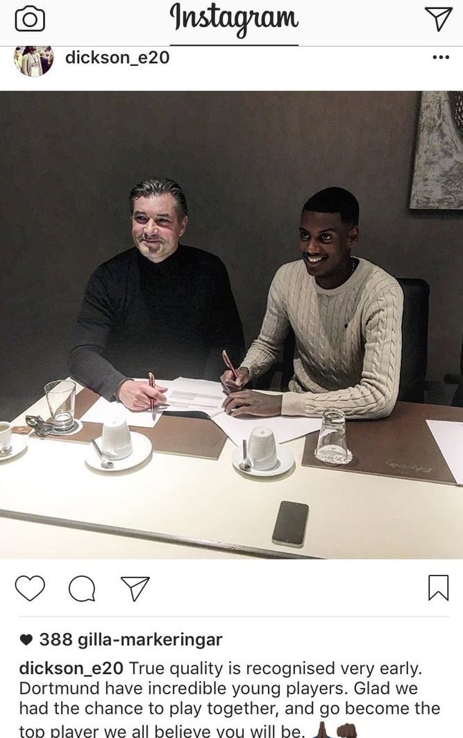 به گزارش خبرگزاری تسنیم، دیکسون اتوهو، همتیمی پیشین الکساندر ایساک در AIK سولنای سوئد تصویری در حساب کاربریاش در شبکه اجتماعی «اینستاگرام» منتشر کرده که نشان میدهد این مهاجم 17 ساله در کنار میشائیل زورک، مدیر ورزشی دورتموند نشسته و قراردادش با این تیم را امضا کرده است، این در حالی است که هنوز هیچیک از دو باشگاه AIK و بورسیا دورتموند این انتقال را تأیید نکردهاند.