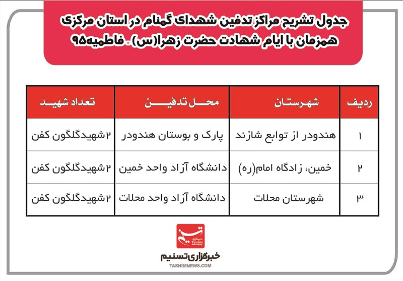 به گزارش خبرگزاری تسنیم از اراک، همزمان با فرارسیدن ایام فاطمیه و شهادت حضرت صدیقه طاهره ام الشهدا(س) و براساس برنامهریزی و پیگیریهای انجام شده از قبل استان مرکزی در ایام عزاداری فاطمه زهرا(س) میزبان 6 شهید گمنام فرزند خمینی کبیر(ره) به ترتیب 2 شهید در زادگاه بنیانگذار کبیر انقلاب اسلامی، 2 شهید در شهر هندودر شازند و 2 شهید در شهرستان محلات خواهد بود.