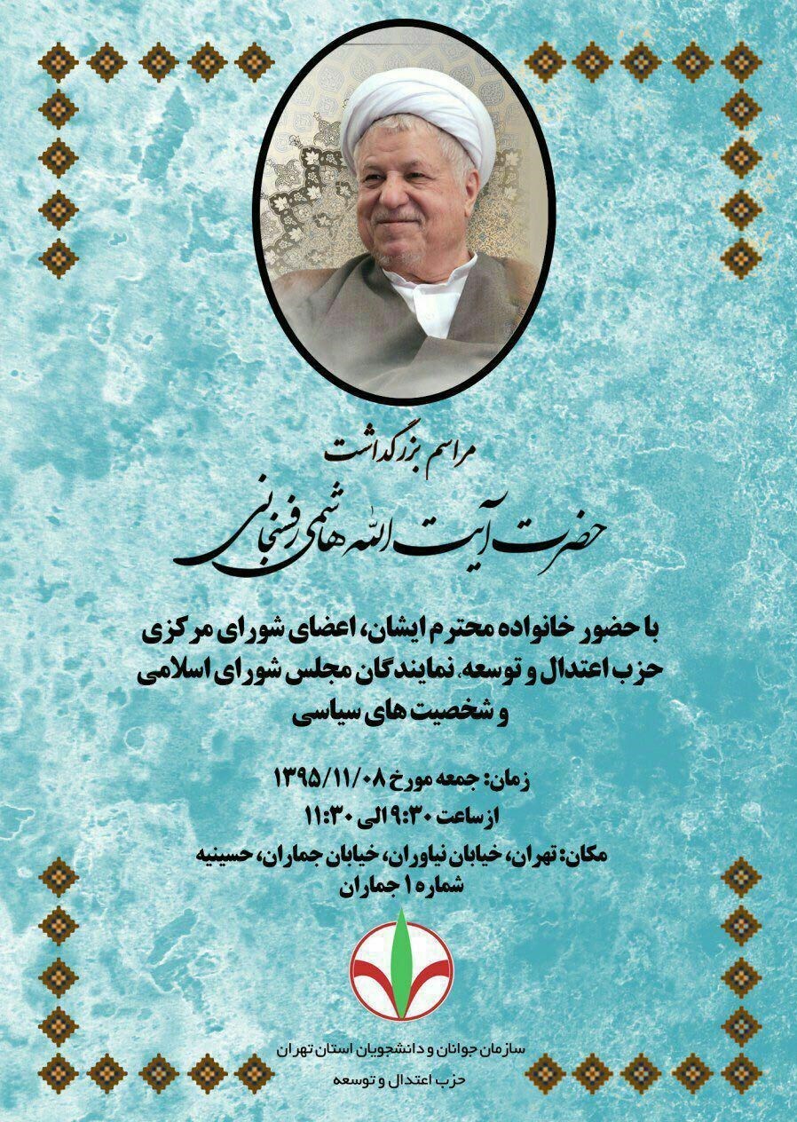 به گزارش خبرنگار سیاسی خبرگزاری تسنیم، مراسم بزرگداشت مرحوم آیتالله هاشمیرفسنجانی رئیس فقید مجمع تشخیص مصلحت نظام در روز جمعه (هشتم بهمنماه) برگزار میشود.