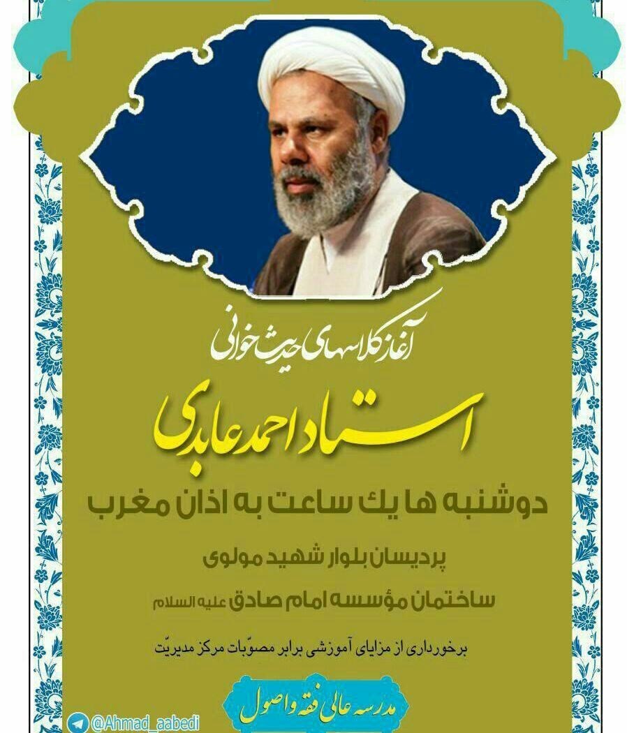 به گزارش خبرنگار فرهنگی باشگاه خبرنگاران تسنیم «پویا»، کلاسهای «حدیثخوانی» حجتالاسلام احمد عابدی، استاد درس خارج حوزه علمیه و رئیس دانشگاه علوم و معارف قرآن کریم به همت سوی مدرسه عالی فقه و اصول حوزه علمیه برگزار میشود.