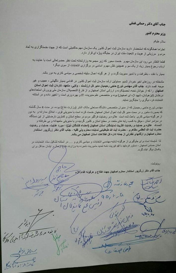 اما نمایندگان استان در ادامه خطاب به وزیر کشور تأکید کردهاند: «شایسته است برای جلوگیری از هرگونه شائبه مهندسی انتخابات و سیاسی کاری و .. در آستانه تشکیل ستاد انتخابات در استان حساس اصفهان دستور فرمایید با قید فوریت نامه تمدید ماموریت نامبرده به وزارت دفاع ارسال و ایشان حداقل برای یک سال دیگر ابقا گردد.»