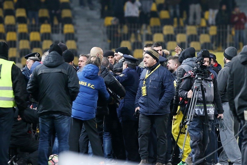 سرمربی پرتغالی یاران انصاریفرد پس از گرفته شدن 10 دقیقه وقت اضافه برای نیمه دوم توسط داور یونانی به سمت داور چهارم رفت و اعتراض شدید خود را ابراز کرد. این عکسالعمل باعث تحریک شدن نیمکت تیم دستهاولی آریس و آغاز درگیریهایی شد که دخالت پلیس را به همراه داشت. بنتو پس از سوت پایان بازی با توجه به اعتراض هواداران تیم آریس با اسکورت پلیس از زمین بازی خارج شد.