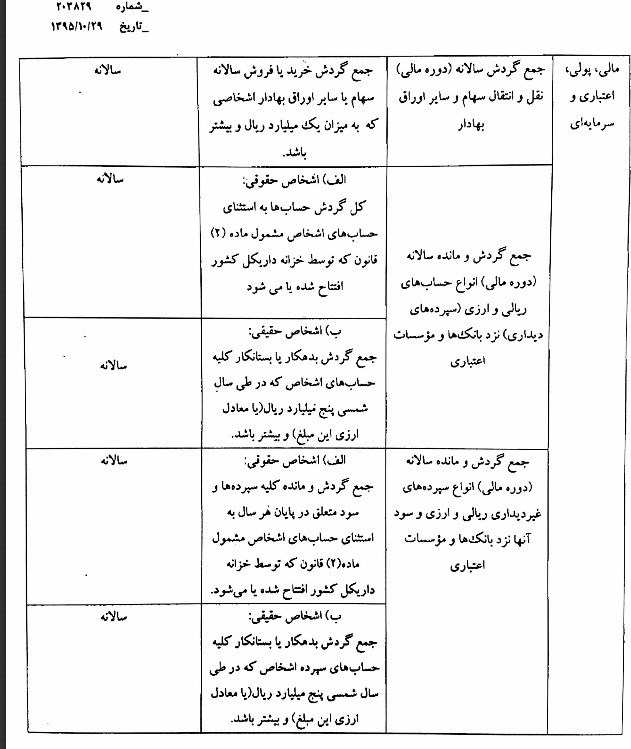 اشخاص حقیقی: جمع گردش بدهکار یا بستانکار کلیه حساب های اشخاص که در طی سال شمسی پانصد میلیون تومان (یا معادل ارزی این مبلغ) و بیشتر باشد