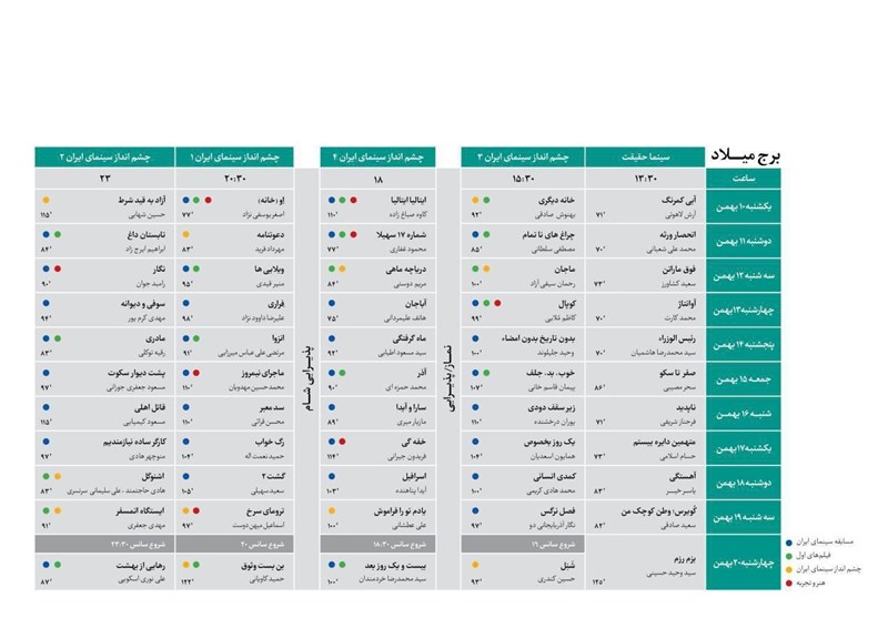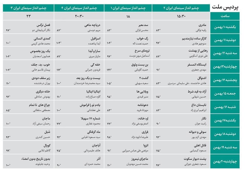 به گزارش باشگاه خبرنگاران تسنیم«پویا»، پردیس ملت در نمایش فیلم‌های خود فیلم‌های بخش چشم‌انداز سینمای ایران را در 4 سانس از ساعت 15:30 (سانس اول) تا ساعت 23 (سانس آخر) برای مردم و هنرمندان به نمایش می‌گذارد و در برنامه برج میلاد، اهالی رسانه‌های گروهی از ساعت 13:30 و با نمایش فیلم‌های بخش سینمای مستند آغاز می‌شود و سانس آخر این سالن ساعت 23 در نظر گرفته شده است.