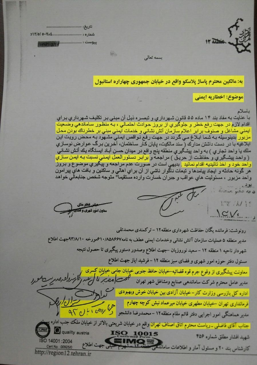یکی از اخطارهای شهرداری درباره ساختمان پلاسکو؛ این اخطاریه به اداره کل بازرسی وزارت کار هم رونوشت شده است