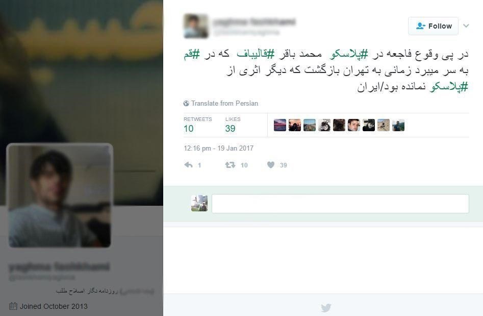 توئیت یک روزنامهنگار اصلاحطلب؛ او به حضور قالیباف در قم همزمان با فروریختن پلاسکو اشاره کرده است