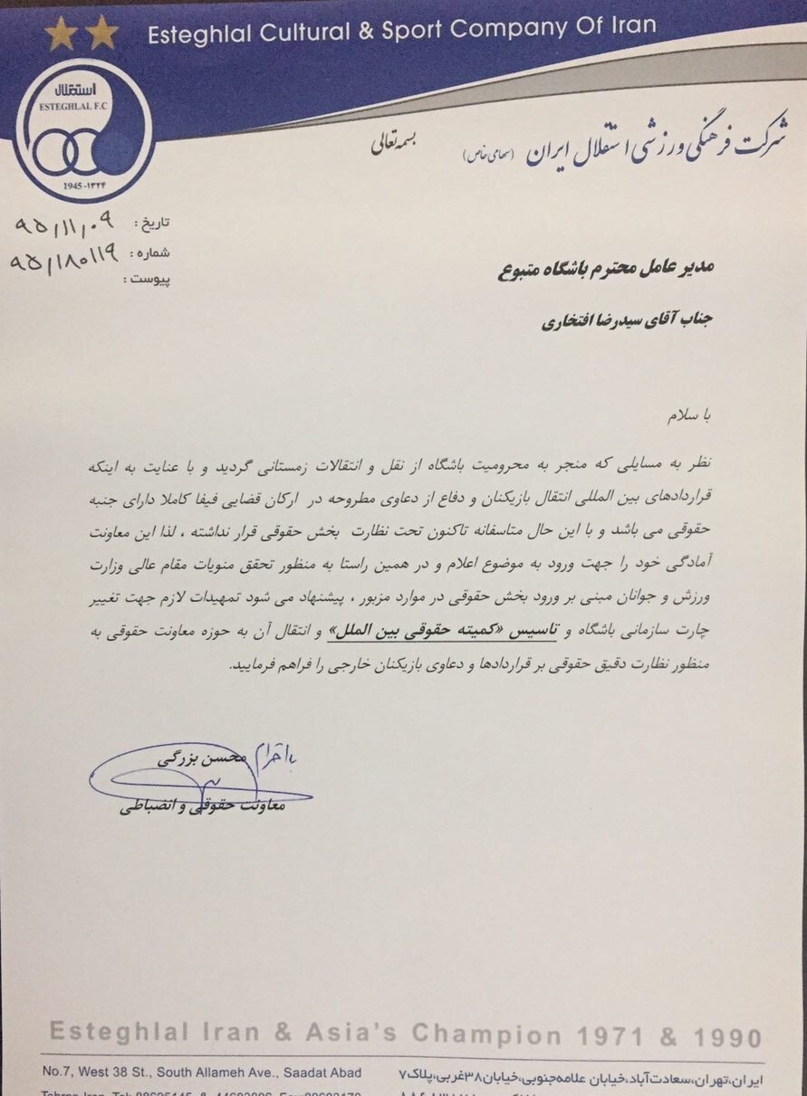 محسن بزرگی، معاون حقوقی باشگاه استقلال با ارسال نامهای به سیدرضا افتخاری مدیرعامل باشگاه که آن را در اختیار خبرگزاری تسنیم قرار داده است، پیشنهاد داده که کمیته حقوقی بینالملل در باشگاه تأسیس شود و زیر نظر معاونت حقوقی قرار گیرد.