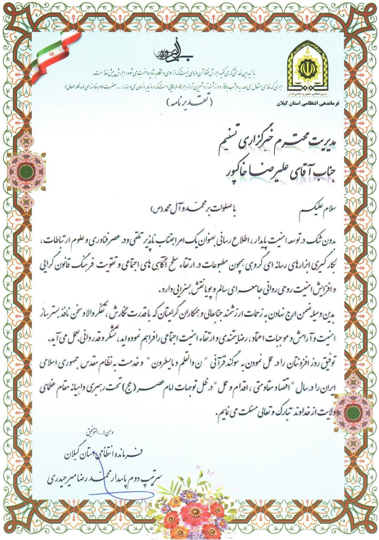 در بخشی از این "تقدیرنامه" آمده است: بدین وسیله ضمن ارج نهادن به زحمات ارزشمند جنابعالی و همکاران گرامیتان که با قدرت نگارش، تفکر والا و سخن نافذ بسترساز امنیت و آرامش و موجبات اعتماد، رضایتمندی و ارتقاء امنیت اجتماعی را فراهم کردهاید تشکر و قدردانی بهعمل میآید.